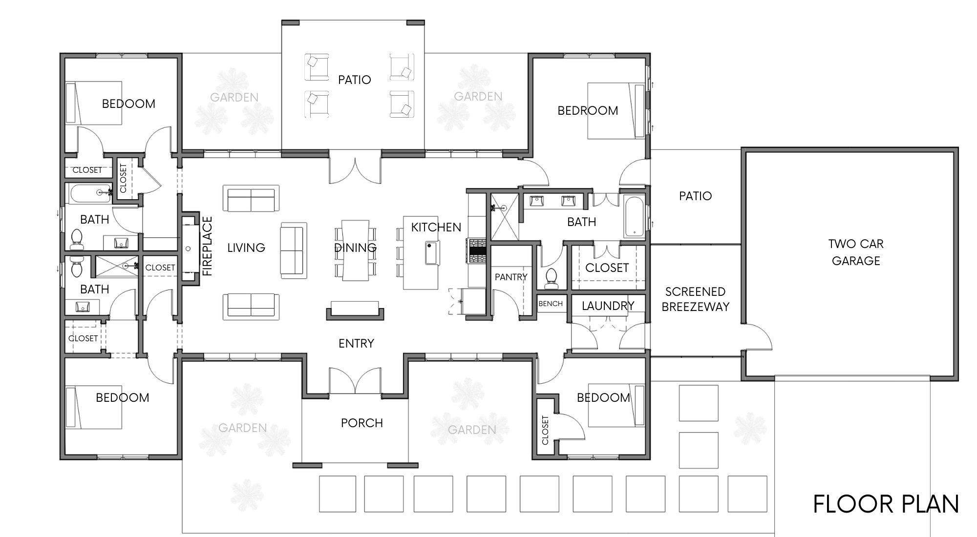 This Skylark is for the fan of symmetrical design and open concept. This layout allows for natural light and views from the Living, Kitchen, and Dining spaces with connection to covered outdoor spaces. Planting areas off the main spaces create a serene oasis from inside and outside the home. With four bedrooms and three bathrooms, this house has plenty of room for friends and family. Includes a large pantry, multiple storage areas, a two-car garage, and a bonus breezeway. High ceilings, natural light in every livable room, and multiple storage spaces make this home as comfortable as it is functional. It is sized to be able to fit a more narrow lot at 36'-0" wide.